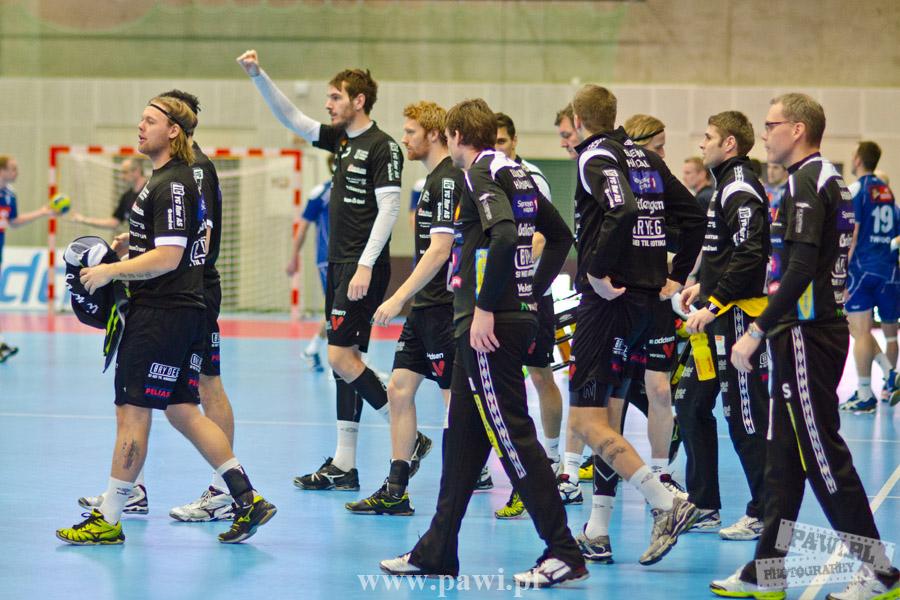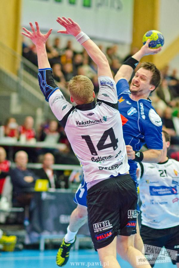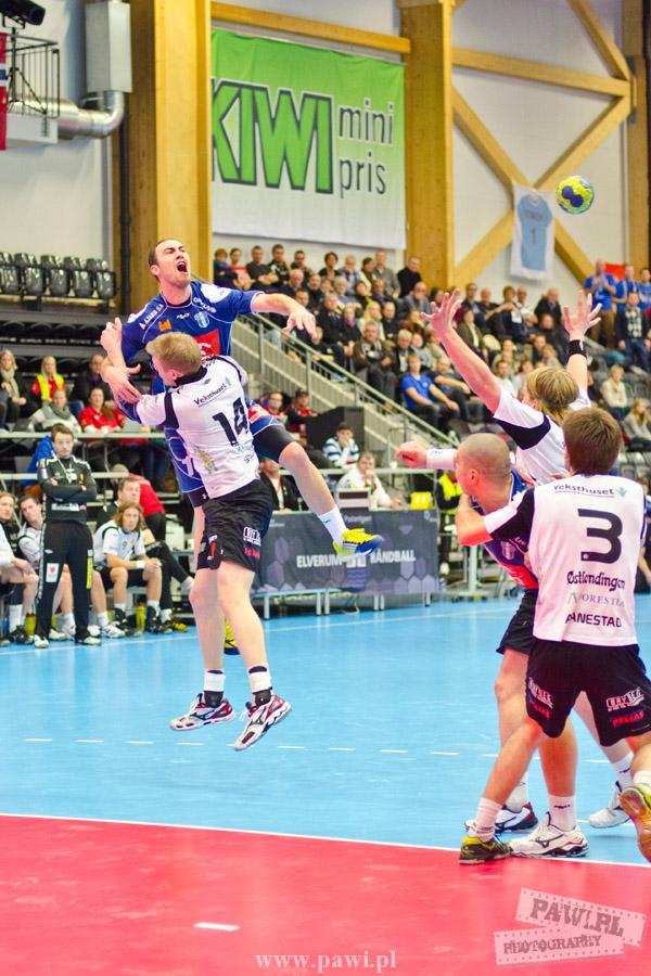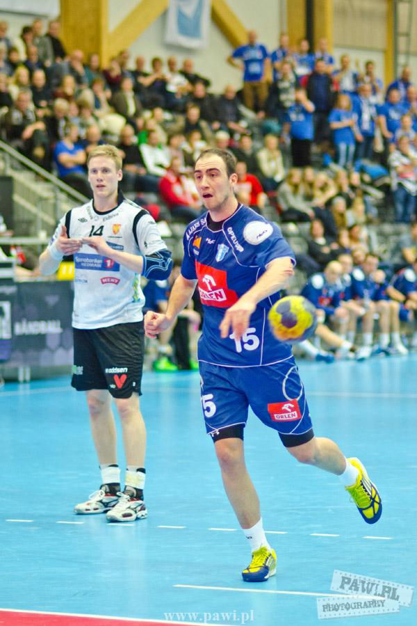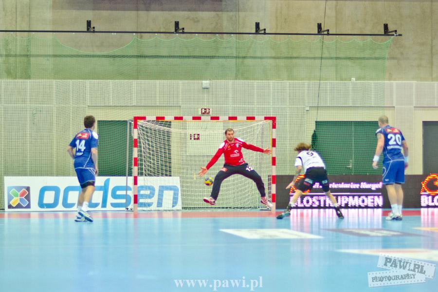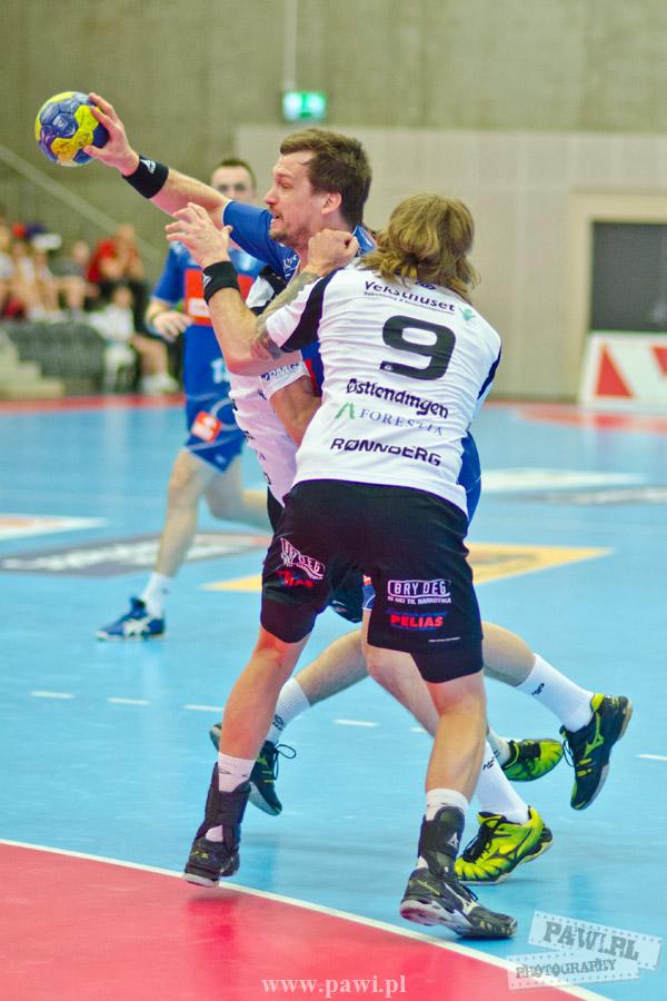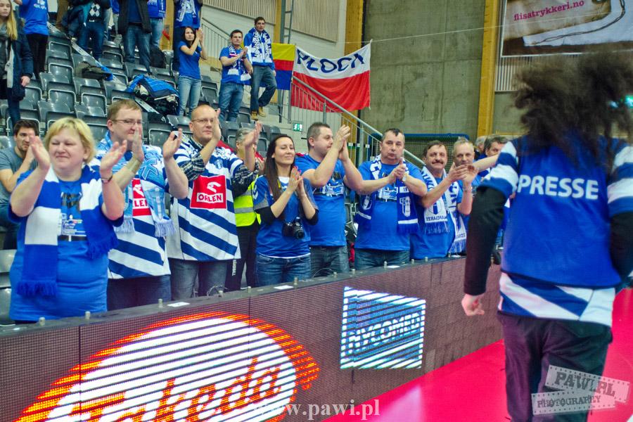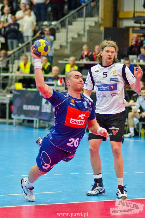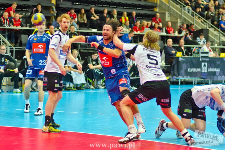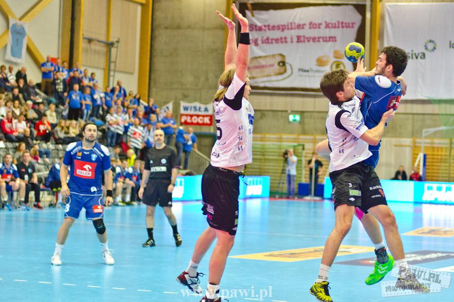 Początek w wykonaniu naszej drużyny stał pod znakiem rażącej nieskuteczności i serii prostych błędów. Gospodarze wykorzystali słabszą postawę Wiślaków, prezentując przy tym styl gry, o którym jeszcze przed pojedynkiem opowiadali Nafciarze, czyli podwyższona obrona i szybkie kontrataki. To doprowadziło do stanu 8:4 dla Norwegów, po czym szkoleniowiec naszej drużyny w 16. minucie po raz pierwszy poprosił o przerwę. Po wznowieniu gry przewaga gospodarzy urosła do pięciu czek, co podziałało jak kubeł zimnej wody na wicemistrzów Polski, którzy wyraźnie poprawili skuteczność i już pięć minut później przegrywali tylko 8:10. Rzuty Norwegów natomiast coraz częściej zaczęły odbijać się od Marcina Wicharego, a widzący niemoc swoich podopiecznych Christian Berge położył na stoliku sędziowskim zieloną tabliczkę. Niestety i tym razem minutowa przerwa odmieniła przebieg wydarzeń na parkiecie. Norwegie czterokrotnie znaleźli drogę do bramki Wichury, na co odpowiedział tylko Paweł Paczkowski rzutem z biodra. Dobrą zmianę w płockiej bramce dał Marin Šego, jednak jego koledzy z pola seryjnie marnowali kolejne okazji do odrobienia strat. Wraz z syreną kończącą pierwszą część spotkania, kolejną bramkę na swoim koncie zapisał E.Toft, czym ustalił stan meczu na 14:10 dla gospodarzy. Niestety Nafciarze nie prezentowali formy, do której przyzwyczaili kibiców w pierwszej części sezonu. Elverum całkowicie zneutralizowało płockich skrzydłowych oraz Petara Nenadicia, który mimo kilku prób zapisał na swoim koncie tylko jedno trafienie.