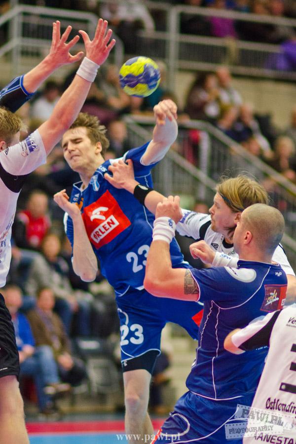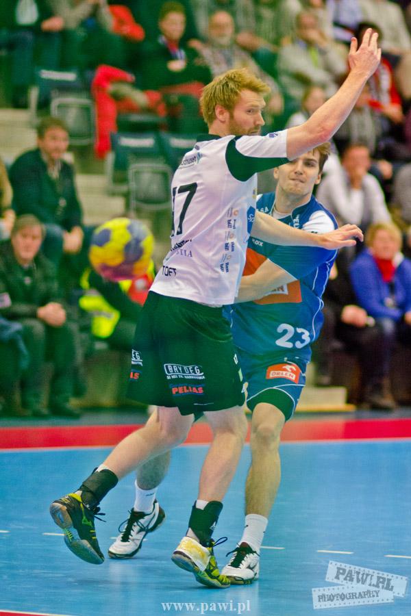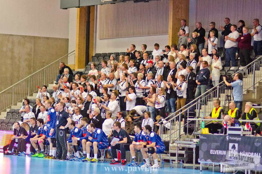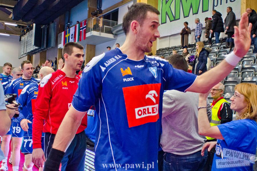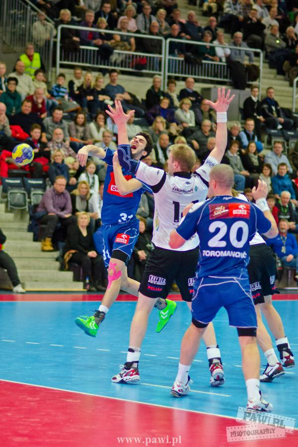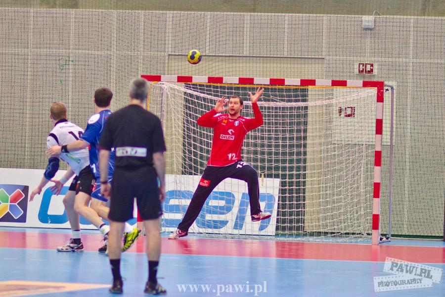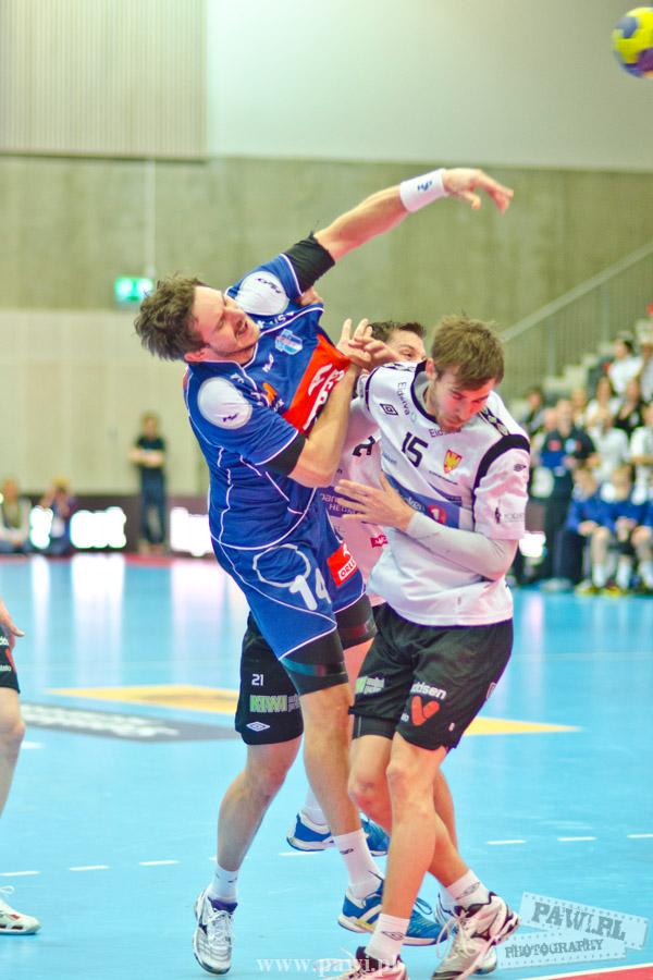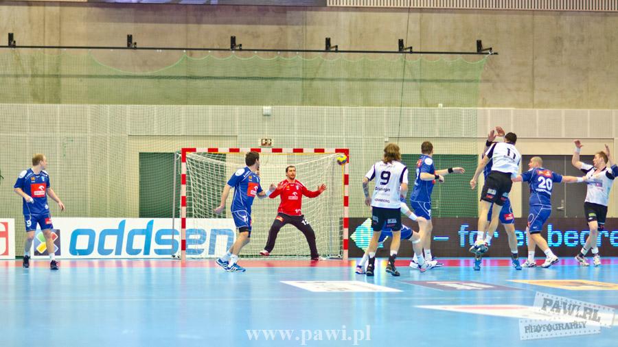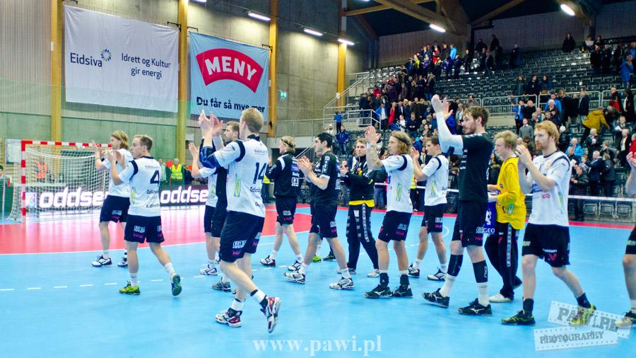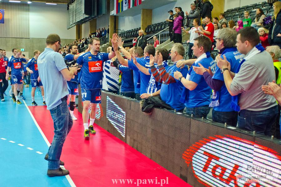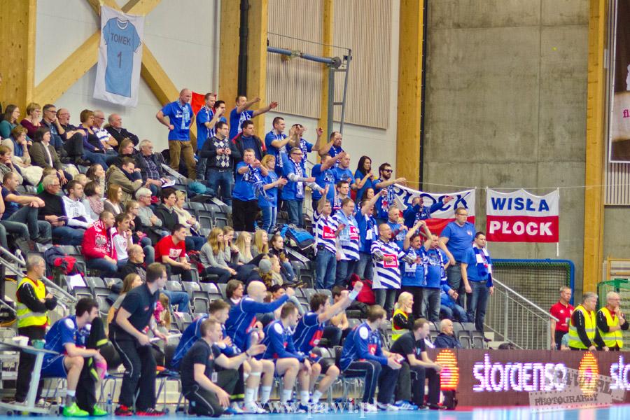 Początek w wykonaniu naszej drużyny stał pod znakiem rażącej nieskuteczności i serii prostych błędów. Gospodarze wykorzystali słabszą postawę Wiślaków, prezentując przy tym styl gry, o którym jeszcze przed pojedynkiem opowiadali Nafciarze, czyli podwyższona obrona i szybkie kontrataki. To doprowadziło do stanu 8:4 dla Norwegów, po czym szkoleniowiec naszej drużyny w 16. minucie po raz pierwszy poprosił o przerwę. Po wznowieniu gry przewaga gospodarzy urosła do pięciu czek, co podziałało jak kubeł zimnej wody na wicemistrzów Polski, którzy wyraźnie poprawili skuteczność i już pięć minut później przegrywali tylko 8:10. Rzuty Norwegów natomiast coraz częściej zaczęły odbijać się od Marcina Wicharego, a widzący niemoc swoich podopiecznych Christian Berge położył na stoliku sędziowskim zieloną tabliczkę. Niestety i tym razem minutowa przerwa odmieniła przebieg wydarzeń na parkiecie. Norwegie czterokrotnie znaleźli drogę do bramki Wichury, na co odpowiedział tylko Paweł Paczkowski rzutem z biodra. Dobrą zmianę w płockiej bramce dał Marin Šego, jednak jego koledzy z pola seryjnie marnowali kolejne okazji do odrobienia strat. Wraz z syreną kończącą pierwszą część spotkania, kolejną bramkę na swoim koncie zapisał E.Toft, czym ustalił stan meczu na 14:10 dla gospodarzy. Niestety Nafciarze nie prezentowali formy, do której przyzwyczaili kibiców w pierwszej części sezonu. Elverum całkowicie zneutralizowało płockich skrzydłowych oraz Petara Nenadicia, który mimo kilku prób zapisał na swoim koncie tylko jedno trafienie.